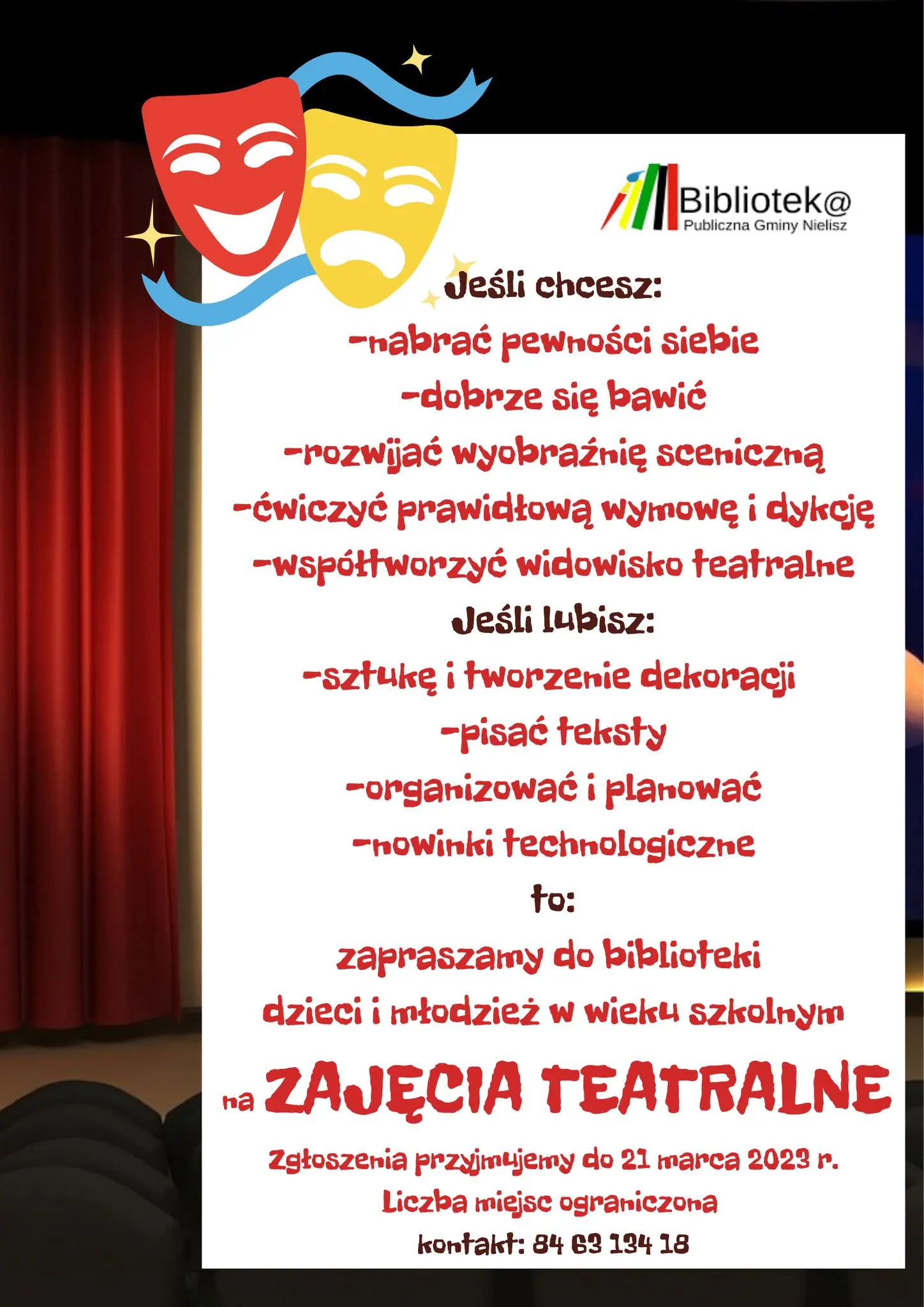 Zajęcia teatralne- zaproszenie 04.03.2023 bpgnielisz 0 TwitterFacebookPinterestGoogle+RSS Previous article BIBLIOTEKA MAŁEGO CZŁOWIEKA Next article PODAJ DALEJ czyli biblioteczne spotkania z tradycją - relacja bpgnielisz