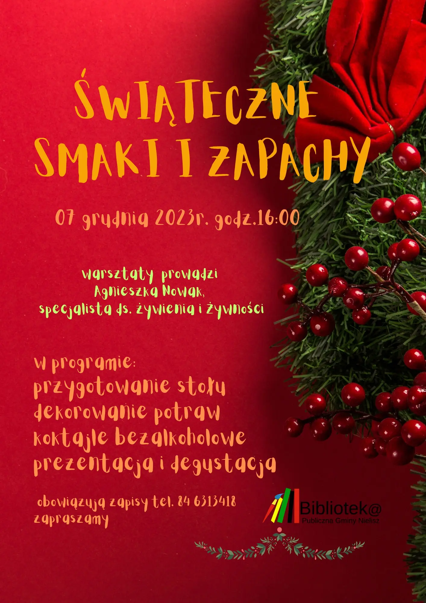 Zbliżają się święta a potem karnawał, czas spotkań i rozmów przy wspólnym stole. Zapraszamy na warsztaty podczas których prowadząca je Pani Agnieszka Nowak zapozna uczestników z różnymi nowinkami, technikami i tradycjami. Zapraszamy i przypominamy, że obowiązują zapisy tel. 84 63 134 18