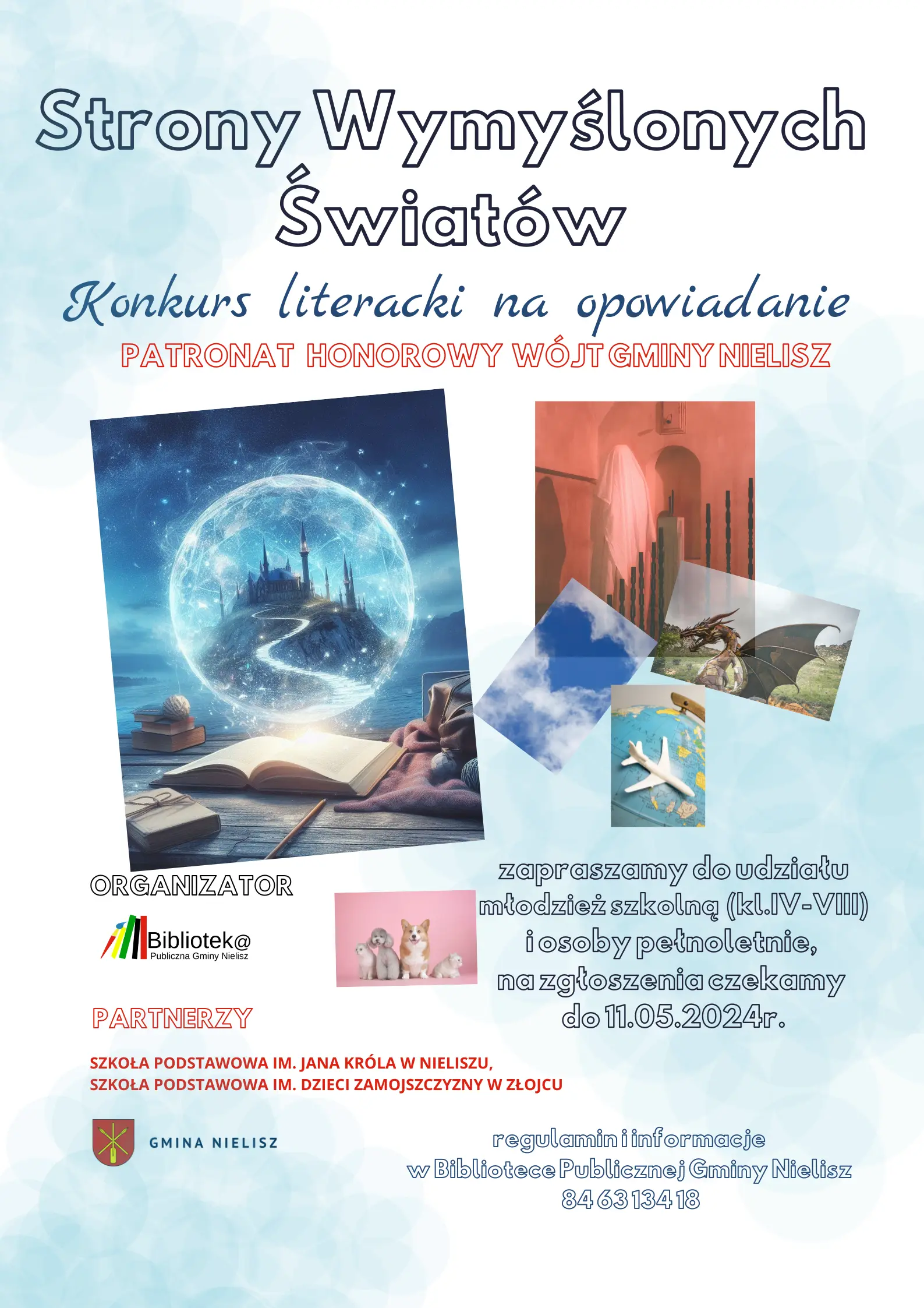 Zachęcamy do udziału w I edycji STRON WYMYŚLONYCH ŚWIATÓW, zadanie polega na napisaniu opowiadania na dowolny temat (szczegóły w regulaminie) . Konkurs organizowany jest przez Bibliotekę Publiczną Gminy Nielisz w partnerstwie ze Szkołą Podstawową im. Dzieci Zamojszczyzny w Złojcu i Szkołą Podstawową im. Jana Króla w Nieliszu, honorowy patronat nad konkursem objął Pan Adam Wal Wójt Gminy Nielisz.