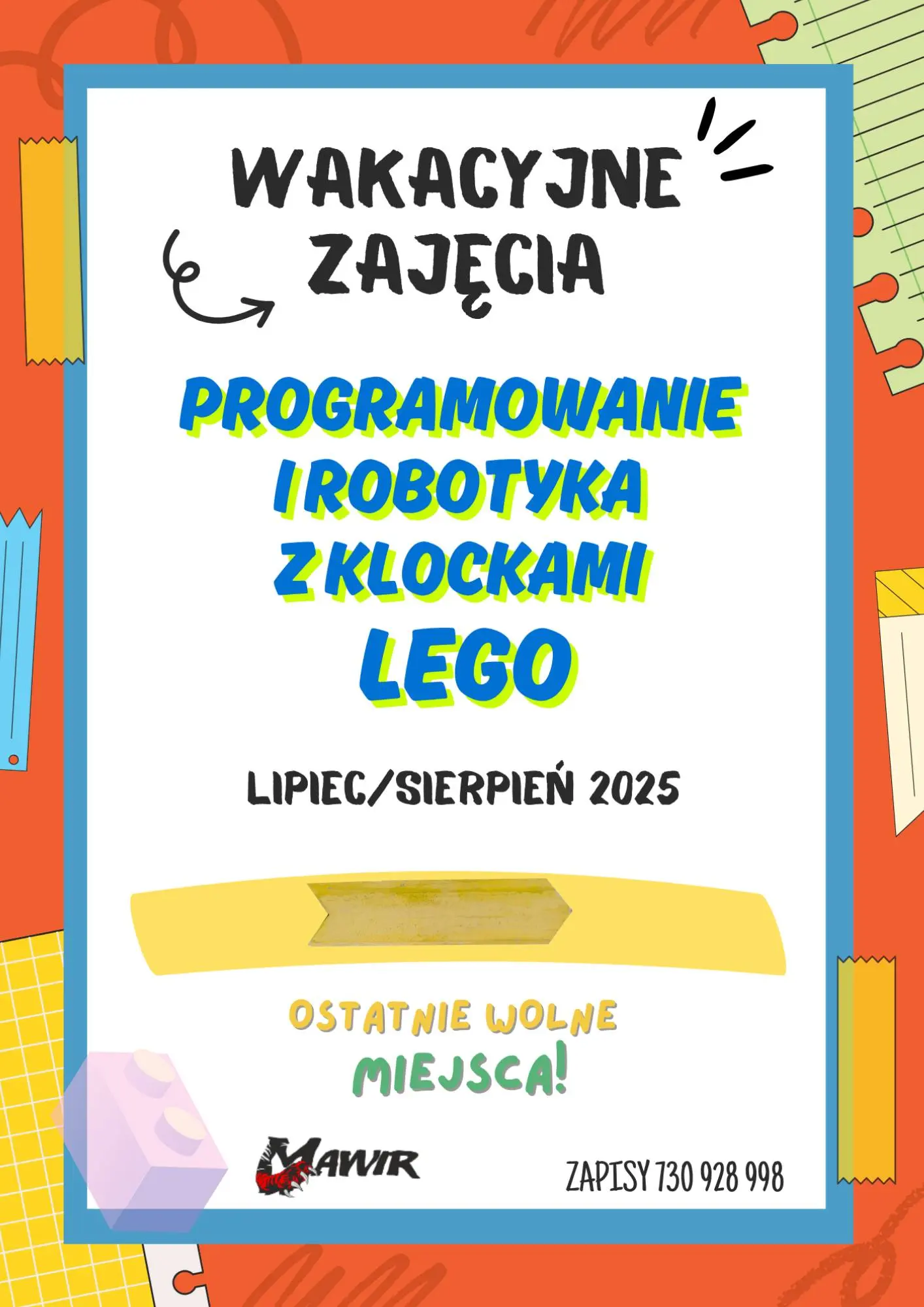 Zbuduj wakacyjną przygodę z Klockami LEGO! Zapraszamy na kreatywne zajęcia z robotyki i programowania z klockami LEGO, które odbywać się będą w bibliotece. Będzie można tworzyć, programować i świetnie się bawić – wszystko przez zabawę i naukę w jednym! Zajęcia dla dzieci w wieku 5–12 lat 📞 Zapisy: 730 928 998 Ilość miejsc ograniczona – dołącz już dziś
