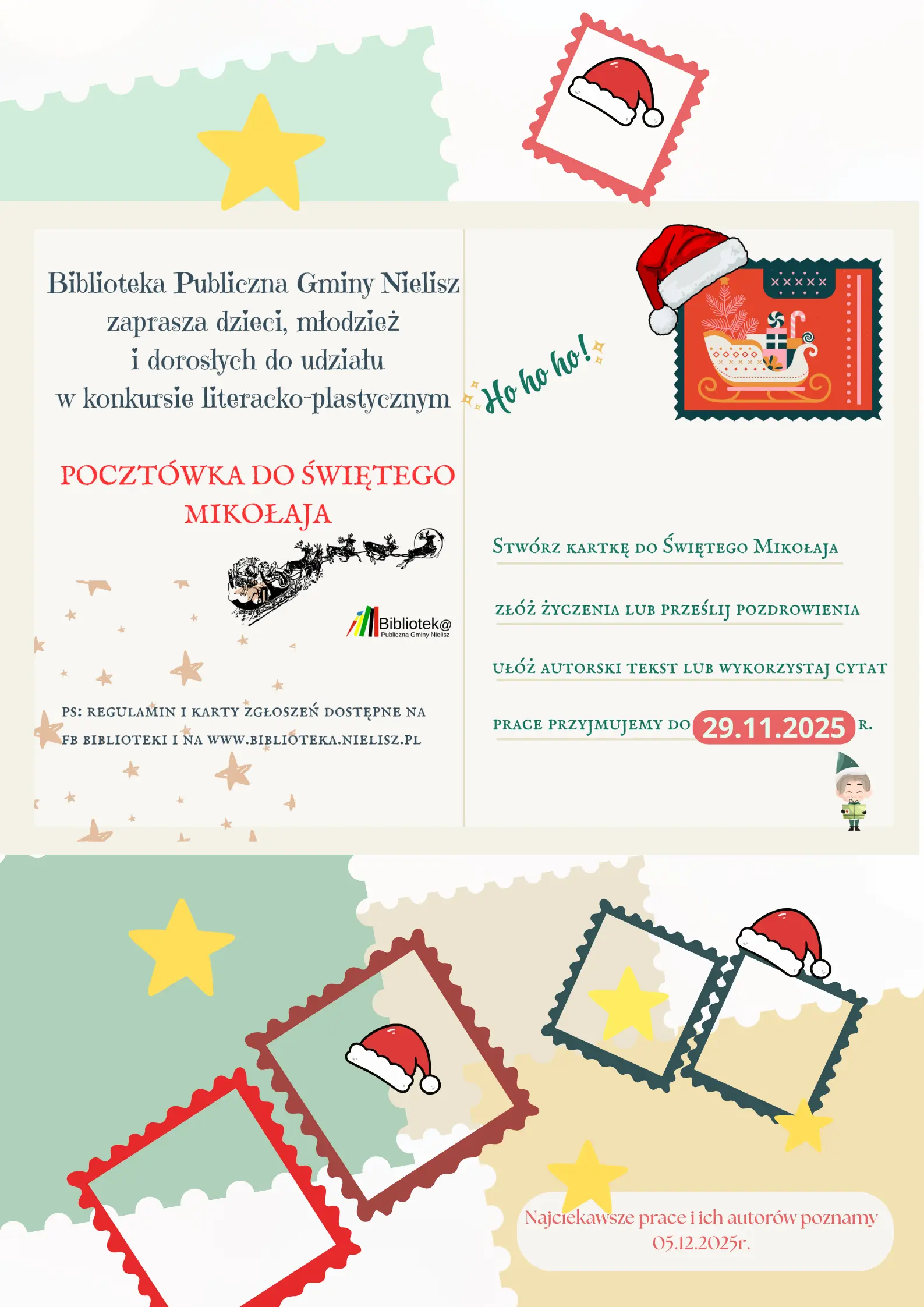 POCZTÓWKA DO ŚWIĘTEGO MIKOŁAJA. 🎅Każdy z nas chyba pisał listy do Św. Mikołaja? Jeśli nie to teraz może to zrobić ! 🎅Zapraszamy do twórczej zabawy dzieci, młodzież i dorosłych, napisz coś lub narysuj aby podziękować Mikołajowi że każdego roku pamięta o nas😍🎁❤️🎅 Mikołaj podziękuje za kreatywność i dobre słowa, zostawiając upominki w Bibliotece. Regulamin konkursu oraz karty zgłoszenia dostępne są na www.biblioteka.nielisz.pl oraz w bibliotece. Zapraszamy do zabawy😍🎁❤️🎅