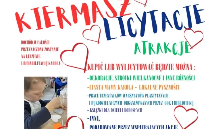 W imieniu Komitetu Społecznego Razem dla Karola zapraszamy do udziału w ogłaszanych licytacjach oraz kiermaszu, który rozpoczyna się w poniedziałek 04 marca br. Więcej szczegółów na zamieszczonym plakacie. Prosimy o udo ...